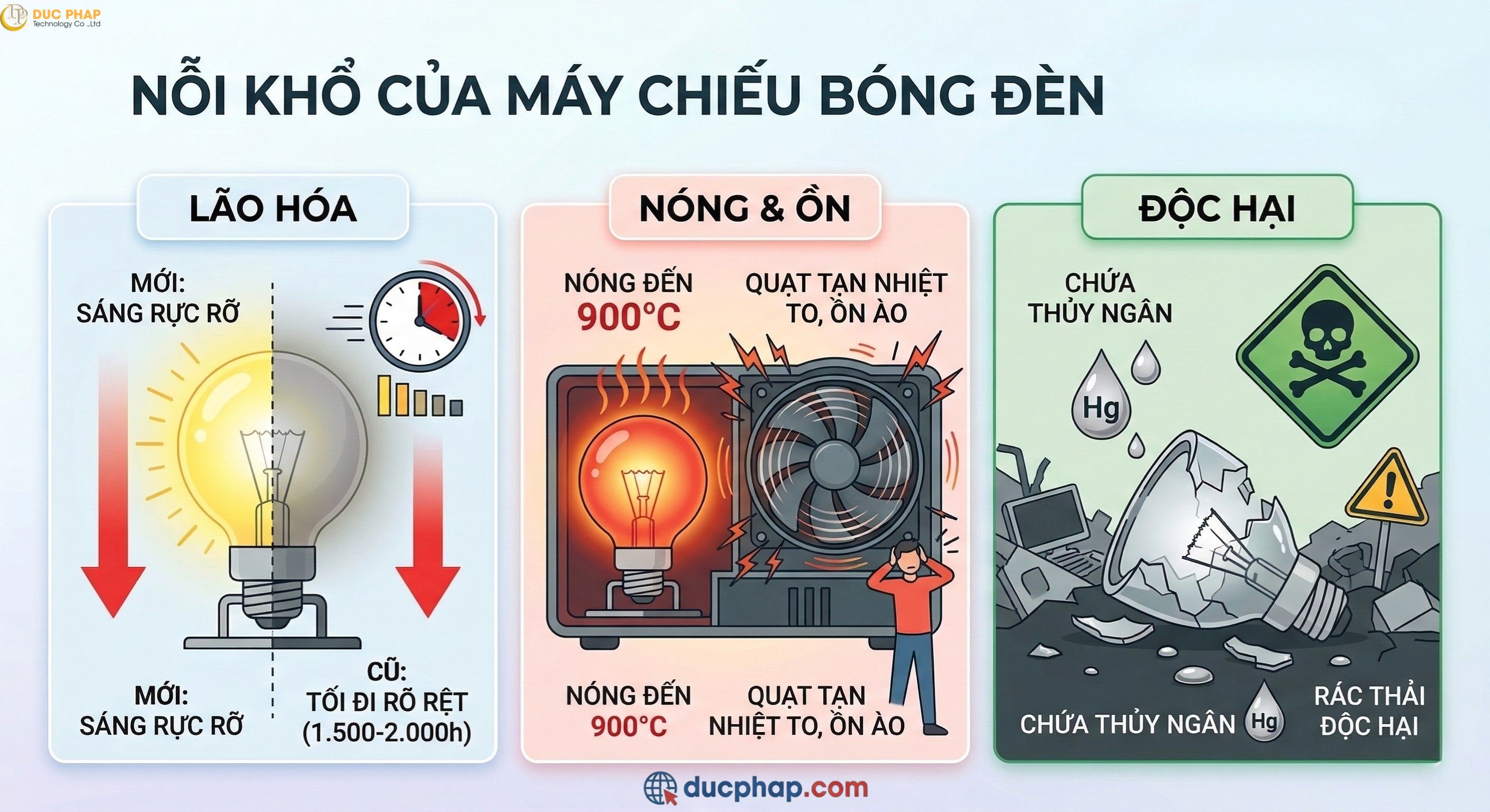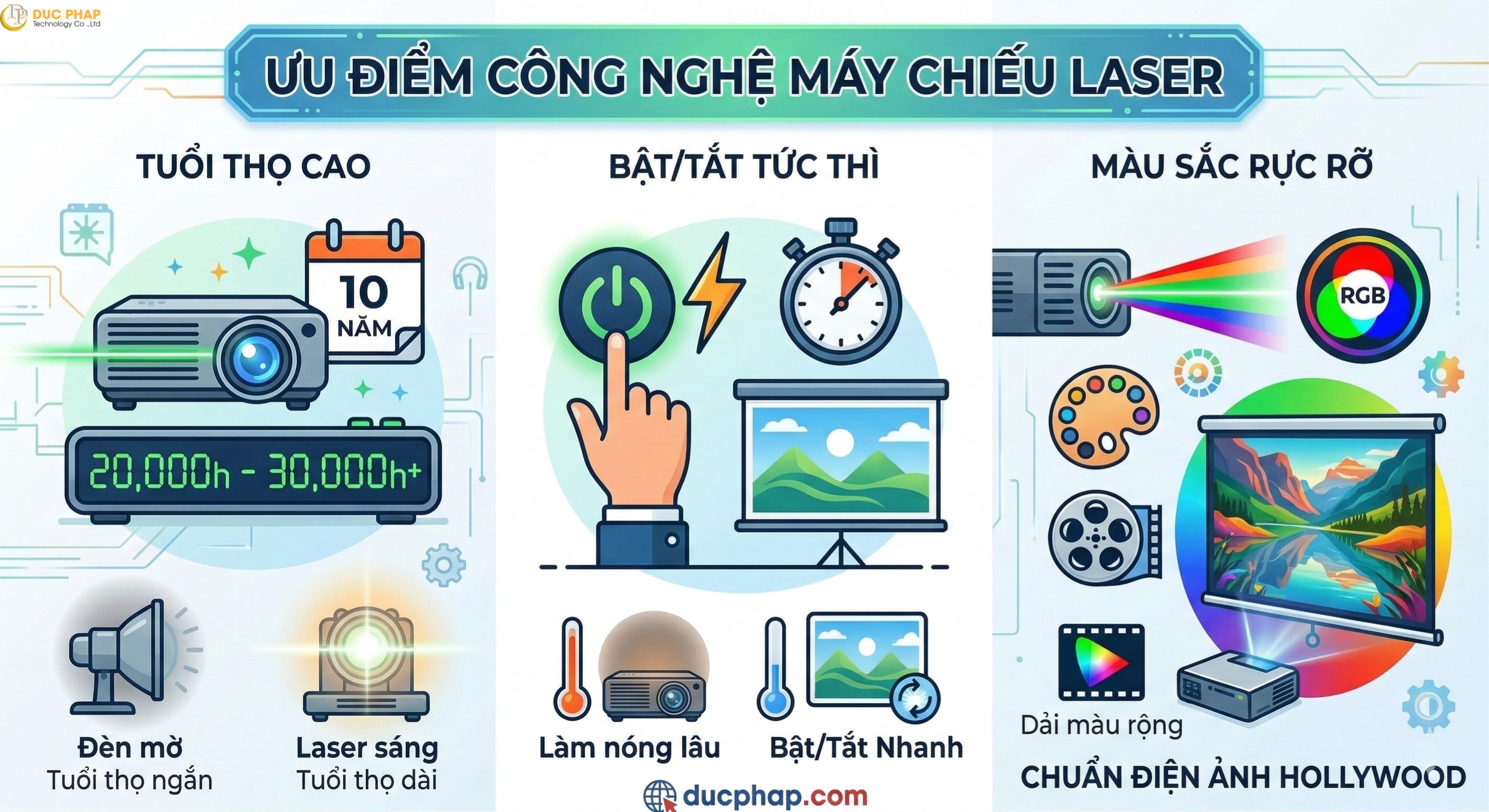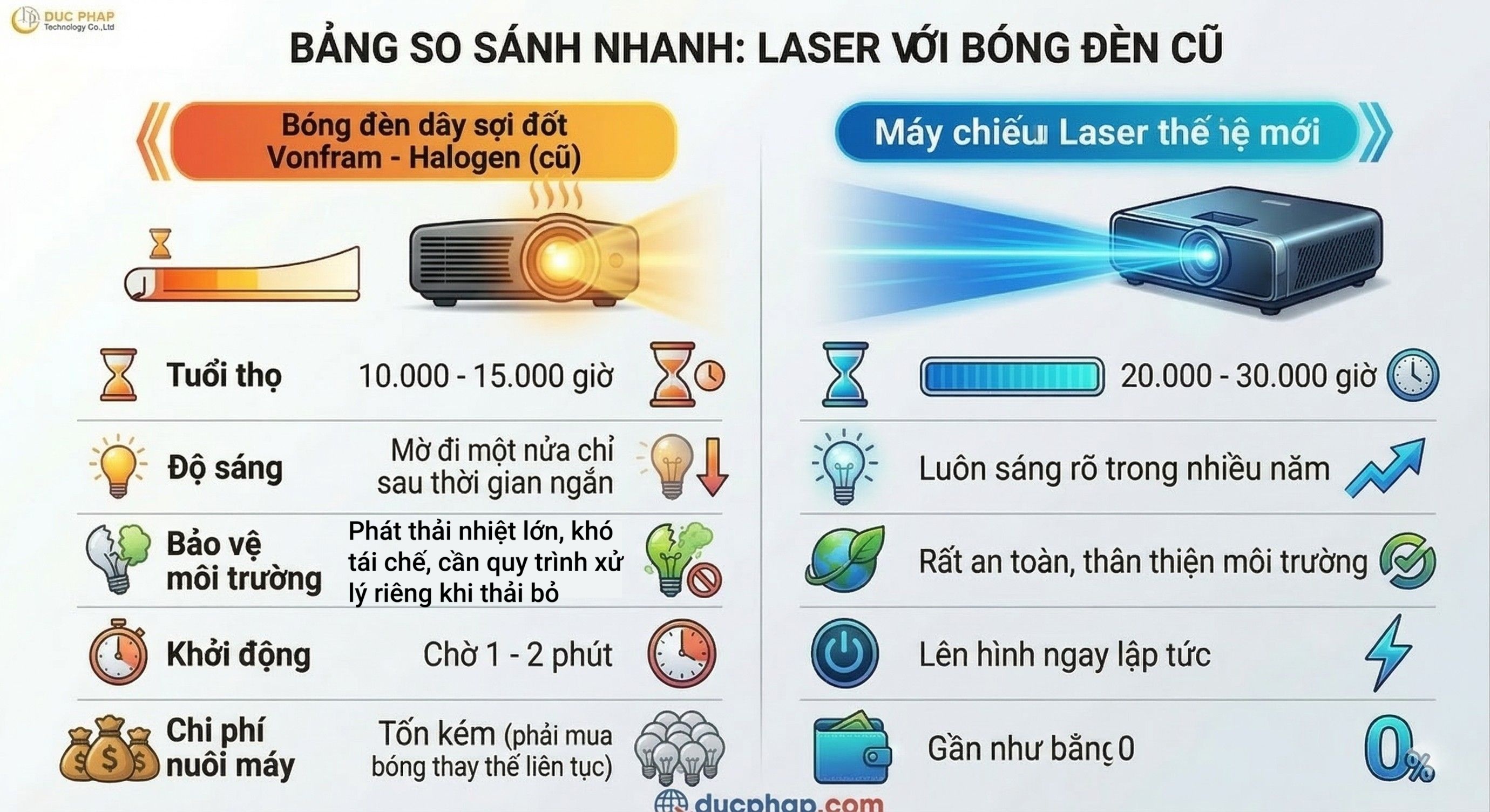 Về bài toán kinh tế: Phải thừa nhận rằng chi phí đầu tư ban đầu cho máy chiếu Laser có thể nhỉnh hơn từ 20% - 30%. Tuy nhiên, nếu xét trên bàn cờ đường dài (tầm nhìn 5-10 năm), bạn chắc chắn sẽ "thu lãi" một khoản khổng lồ nhờ triệt tiêu hoàn toàn chi phí thay bóng đắt đỏ và hóa đơn tiền điện cũng nhẹ đi đáng kể.