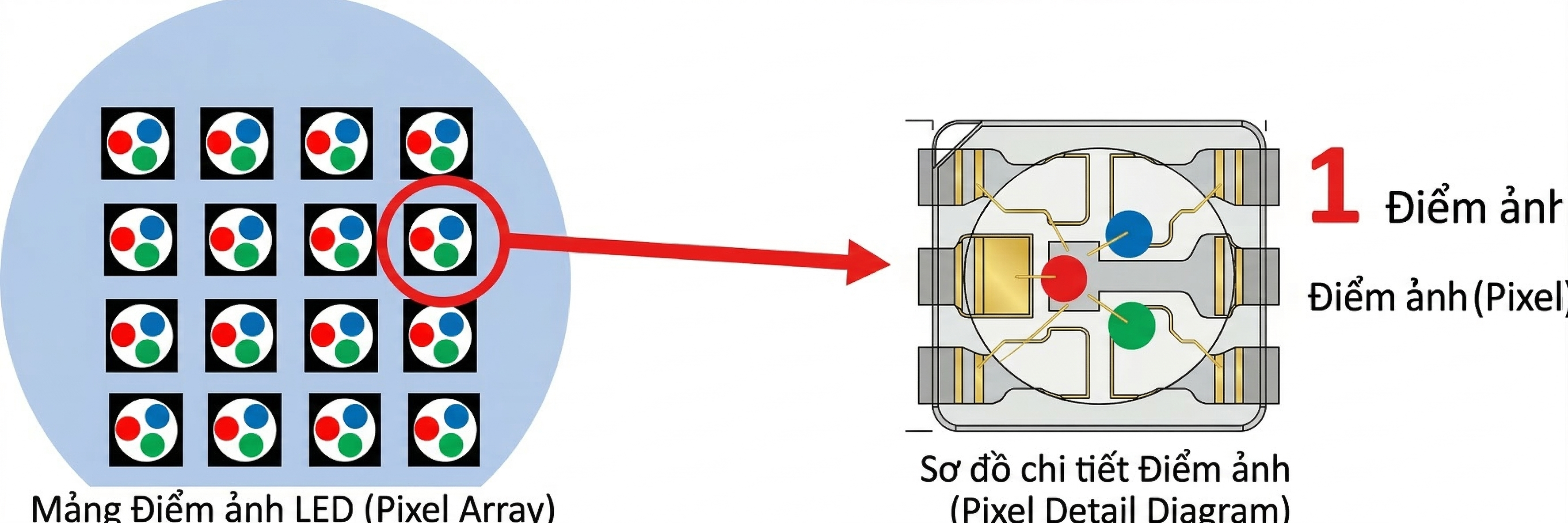 Tiêu chuẩn chuyên ngành: Nếu phân tích kỹ hơn, thông số này không đo đạc ngẫu nhiên giữa hai bóng LED bất kỳ, mà là khoảng cách chuẩn xác giữa các mắt LED sát nhau có chung màu sắc (chẳng hạn: cự ly theo chiều dọc giữa hai tâm bóng đỏ, hoặc khoảng ngang giữa hai bóng xanh lục kề nhau).