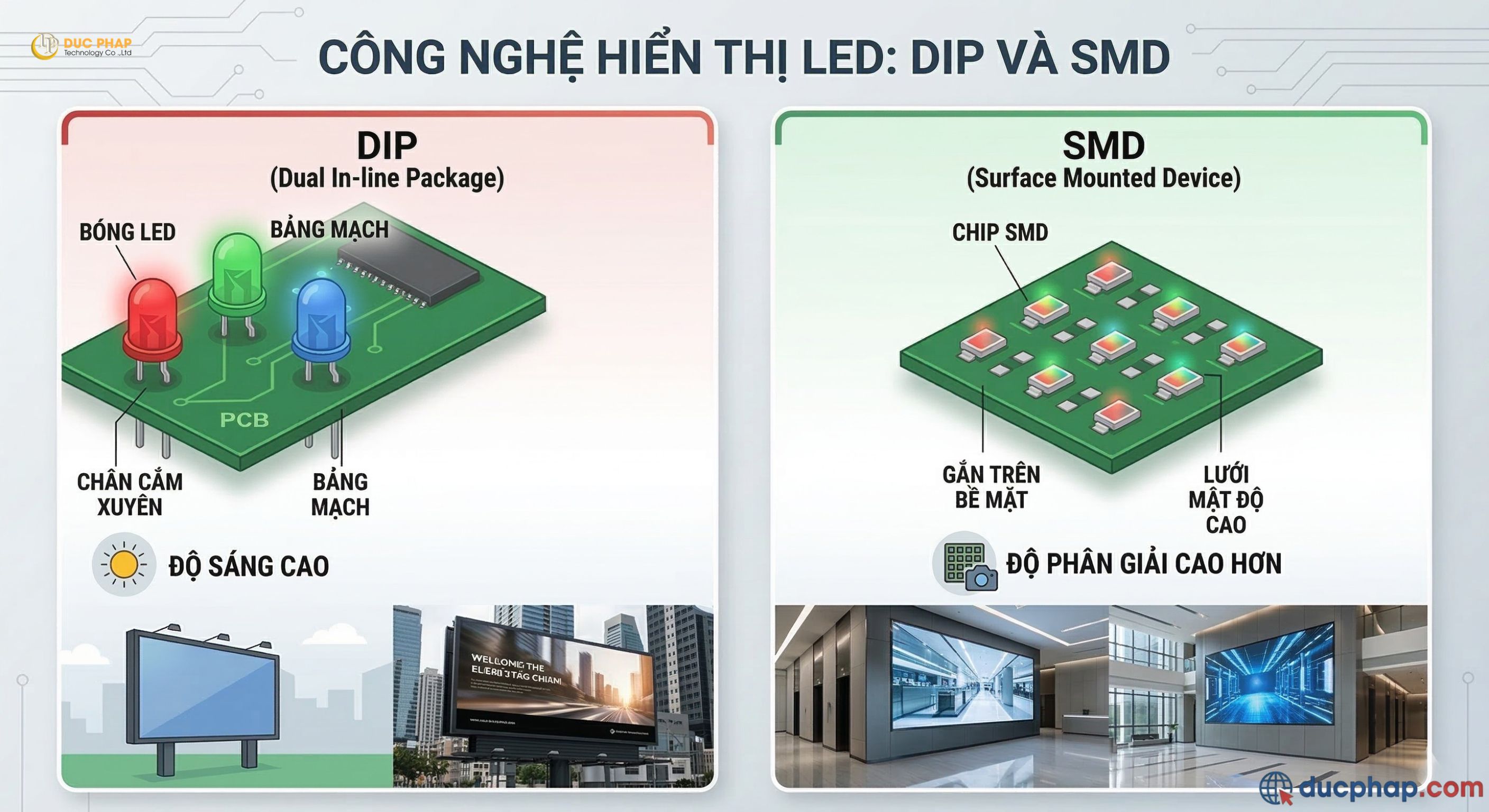 Công nghệ SMD đã thống trị thị trường suốt một thời gian dài. Các chip LED được hàn cố định thẳng lên bề mặt bo mạch (PCB), mở ra khả năng tăng cường mật độ pixel vượt trội hơn DIP. Chính vì thế, SMD đem lại khung hình sắc nét hơn hẳn, có thể linh hoạt sử dụng cho cả trong nhà lẫn ngoài trời.