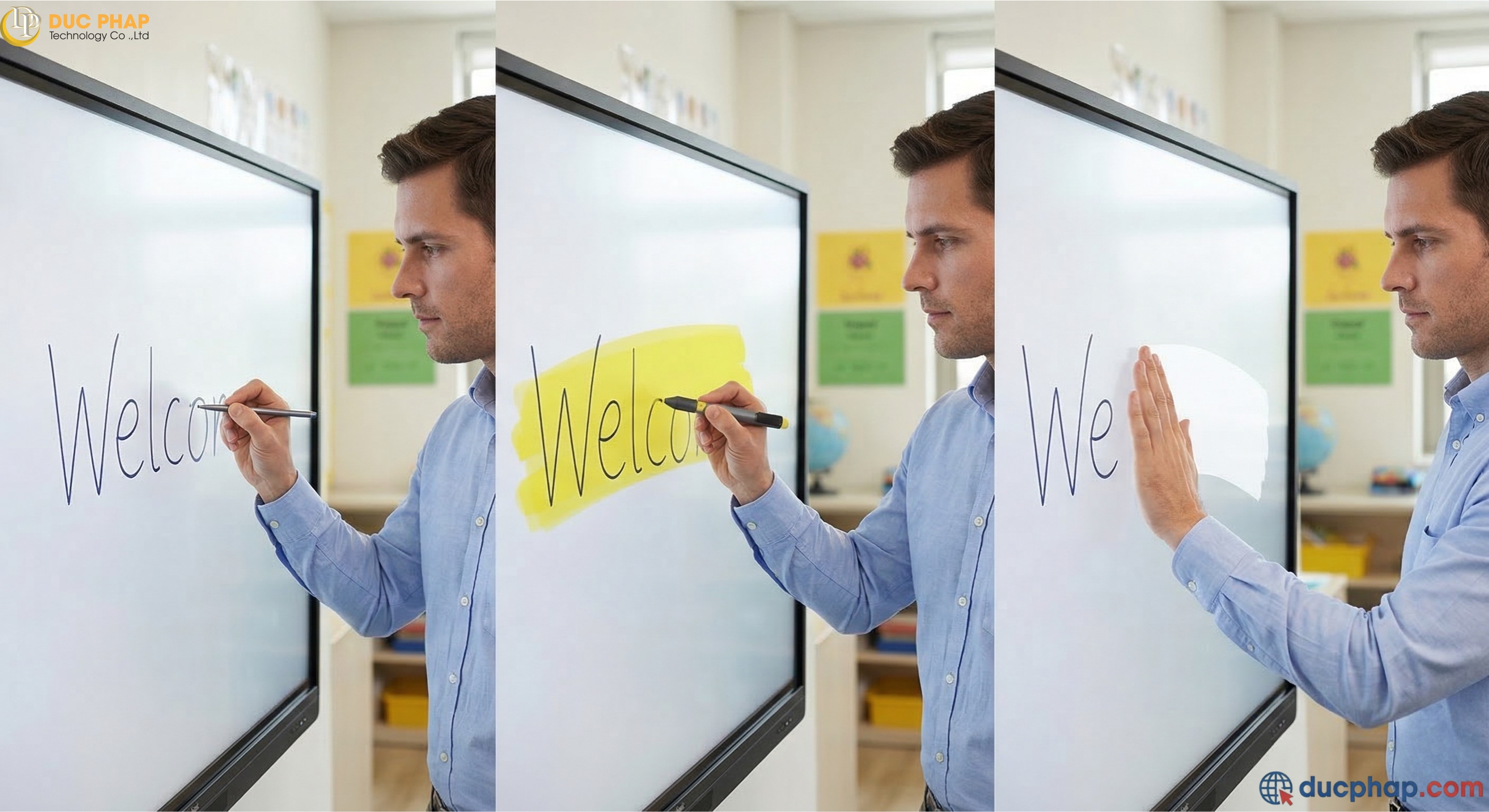 - Công nghệ nhận diện vật thể thông minh (Smart Recognition): Hệ thống có khả năng tự đánh giá kích cỡ của vật chạm. Người dùng có thể viết nét mảnh bằng đầu bút nhỏ, bôi đậm bằng đầu bút to, hoặc đơn giản là dùng cả lòng bàn tay úp lên mặt kính để xóa nội dung. Chuỗi thao tác này diễn ra vô cùng trực quan và liền mạch.