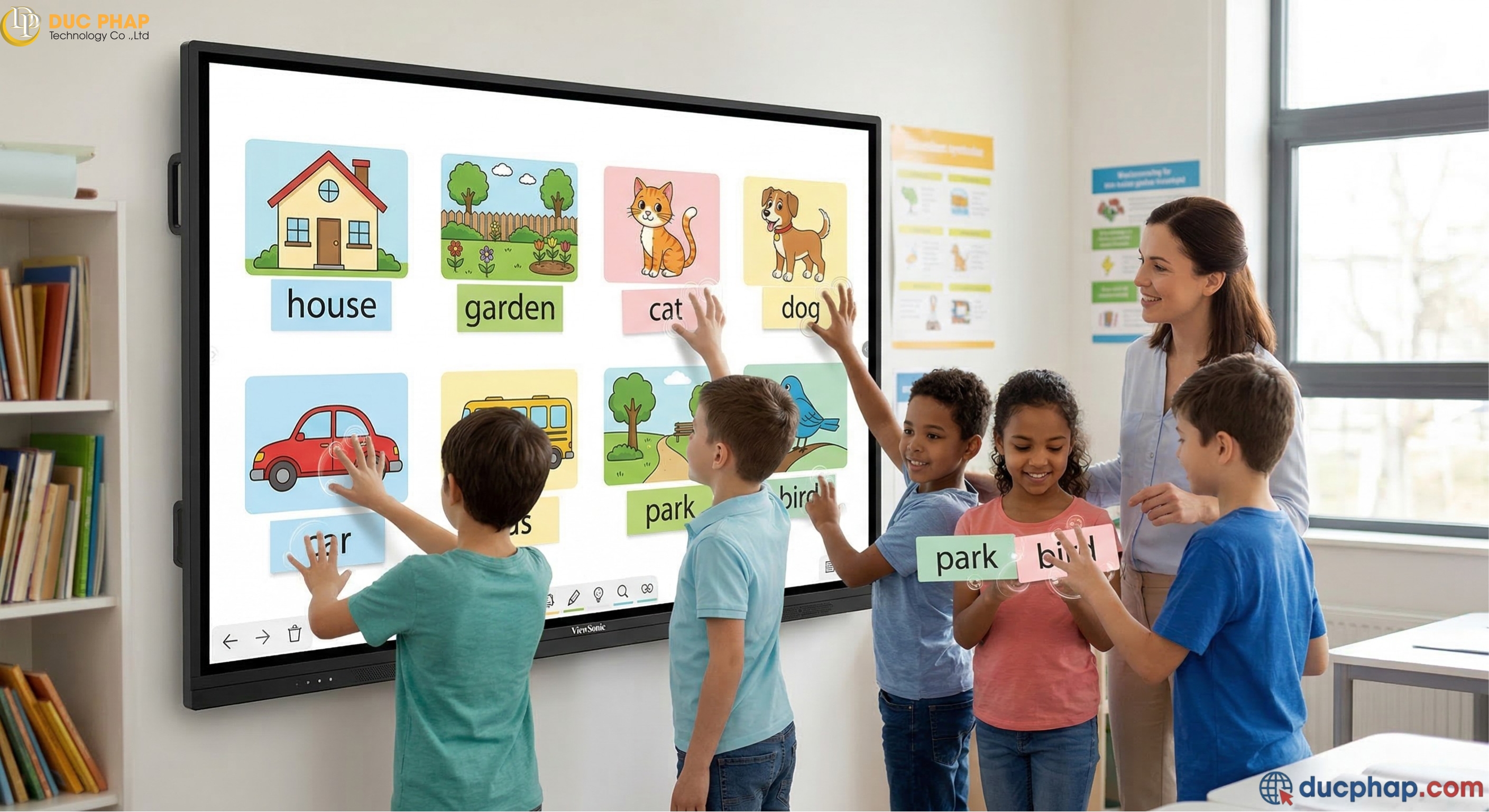 - Khả năng chạm đa điểm xuất sắc: Các model IFP phổ thông hiện cho phép từ 20 đến 40 điểm chạm, trong khi những phiên bản cao cấp (ví dụ: ViewSonic ViewBoard) hỗ trợ tới 64 điểm cùng lúc. Giả sử trong một giờ ngoại ngữ, giáo viên có thể mời 4-5 em học sinh lên thao tác chung. Các em có thể thoải mái kéo thả, nối từ vựng bằng cả mười đầu ngón tay mà thiết bị vẫn xử lý trơn tru, không hề giật lag.