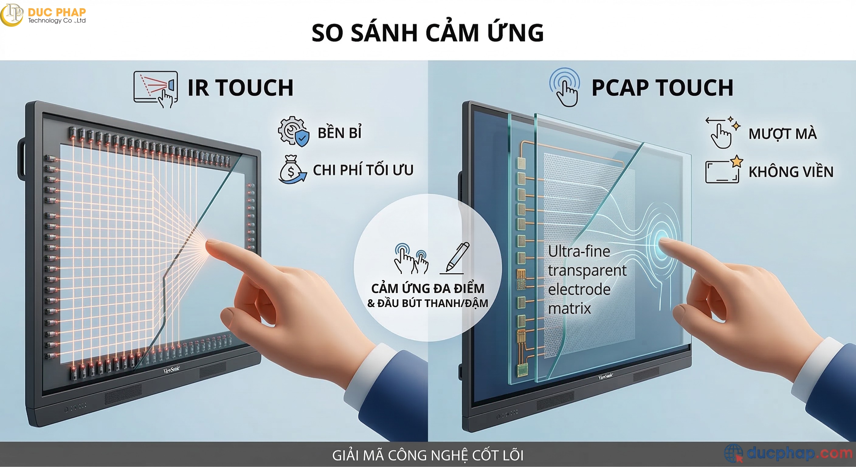 - PCAP (Cảm ứng điện dung) – Đẳng cấp và siêu mượt: Áp dụng màng lưới vi sợi dẫn điện (Micro-mesh) cùng kỹ thuật ép quang học (Optical Bonding) tiên tiến, khoảng cách giữa lớp kính và màn hình hiển thị được triệt tiêu hoàn toàn xuống 0mm. Trải nghiệm thực tế cho thấy, việc vuốt chạm trên màn hình PCAP giống hệt như đang dùng một chiếc máy tính bảng khổng lồ. Thiết kế viền siêu mỏng nguyên khối cũng khiến thiết bị trở thành điểm nhấn sang trọng cho mọi không gian họp hành cao cấp.