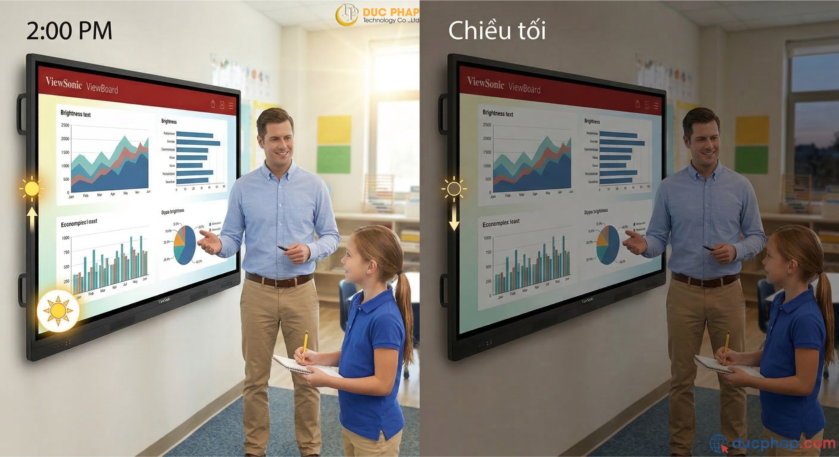- Khả năng tự động điều tiết ánh sáng: Màn hình sẽ tự đo lường ánh sáng xung quanh để tinh chỉnh độ sáng cho phù hợp. Ví dụ, nếu phòng bị hắt nắng gắt vào giữa trưa, hệ thống sẽ đẩy độ sáng lên tối đa để duy trì hiển thị rõ ràng. Khi trời sập tối, màn hình tự động giảm sáng để bảo vệ thị lực người dùng khỏi tình trạng chói lóa.