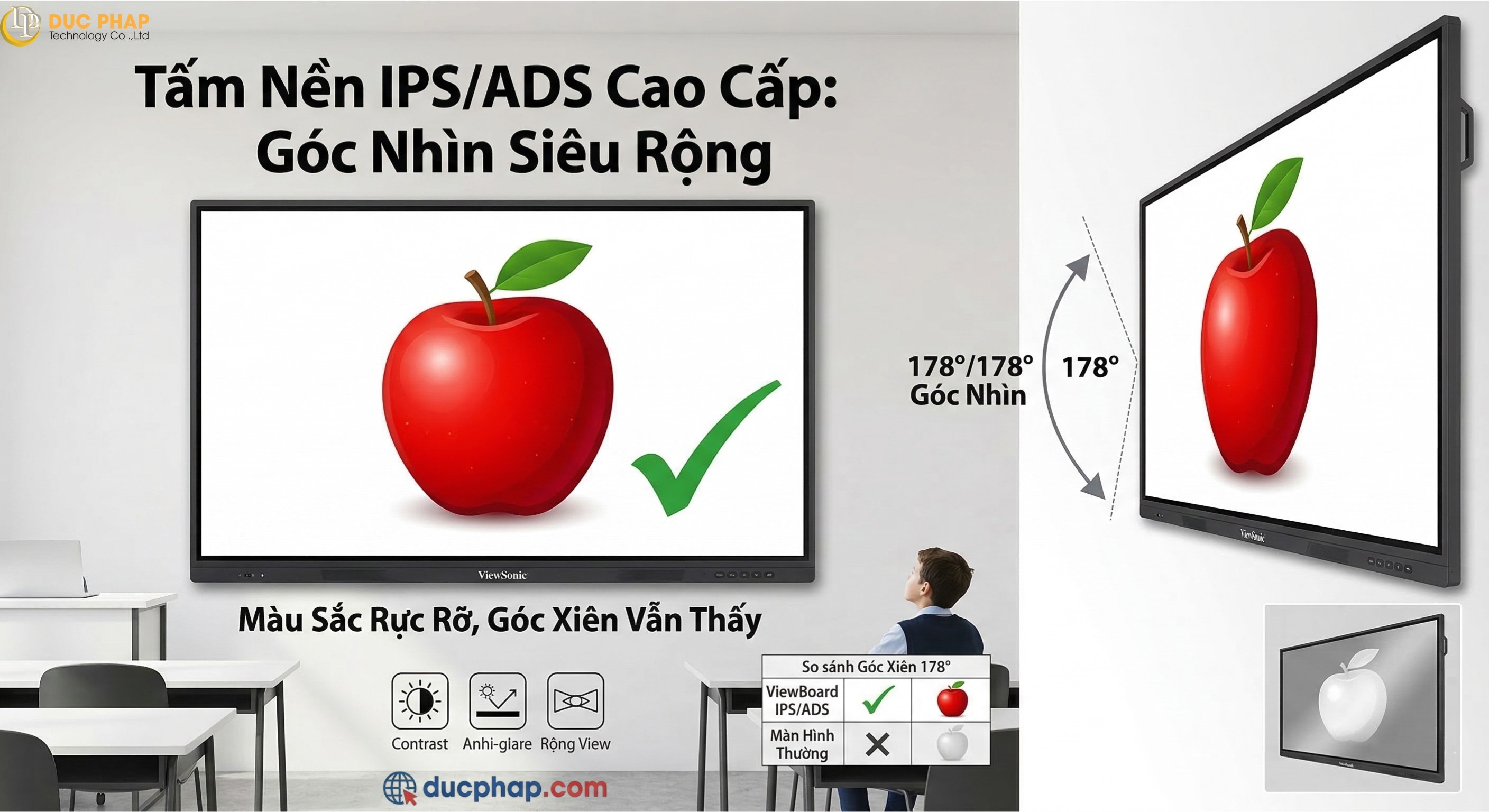 - Tấm nền IPS/ADS chất lượng cao: Khả năng tái hiện màu sắc đỉnh cao đi kèm góc nhìn mở rộng 178°/178° và tỷ lệ tương phản ấn tượng 1200:1 hoặc lên đến 5000:1 (khi kích hoạt DCR). Nhờ đó, dù học viên ngồi ở vị trí chéo góc xa nhất phòng học, họ vẫn quan sát rõ hình ảnh quả táo màu đỏ rực mà không gặp hiện tượng bệt màu hay lóa sáng như trên các thiết bị hiển thị giá rẻ.