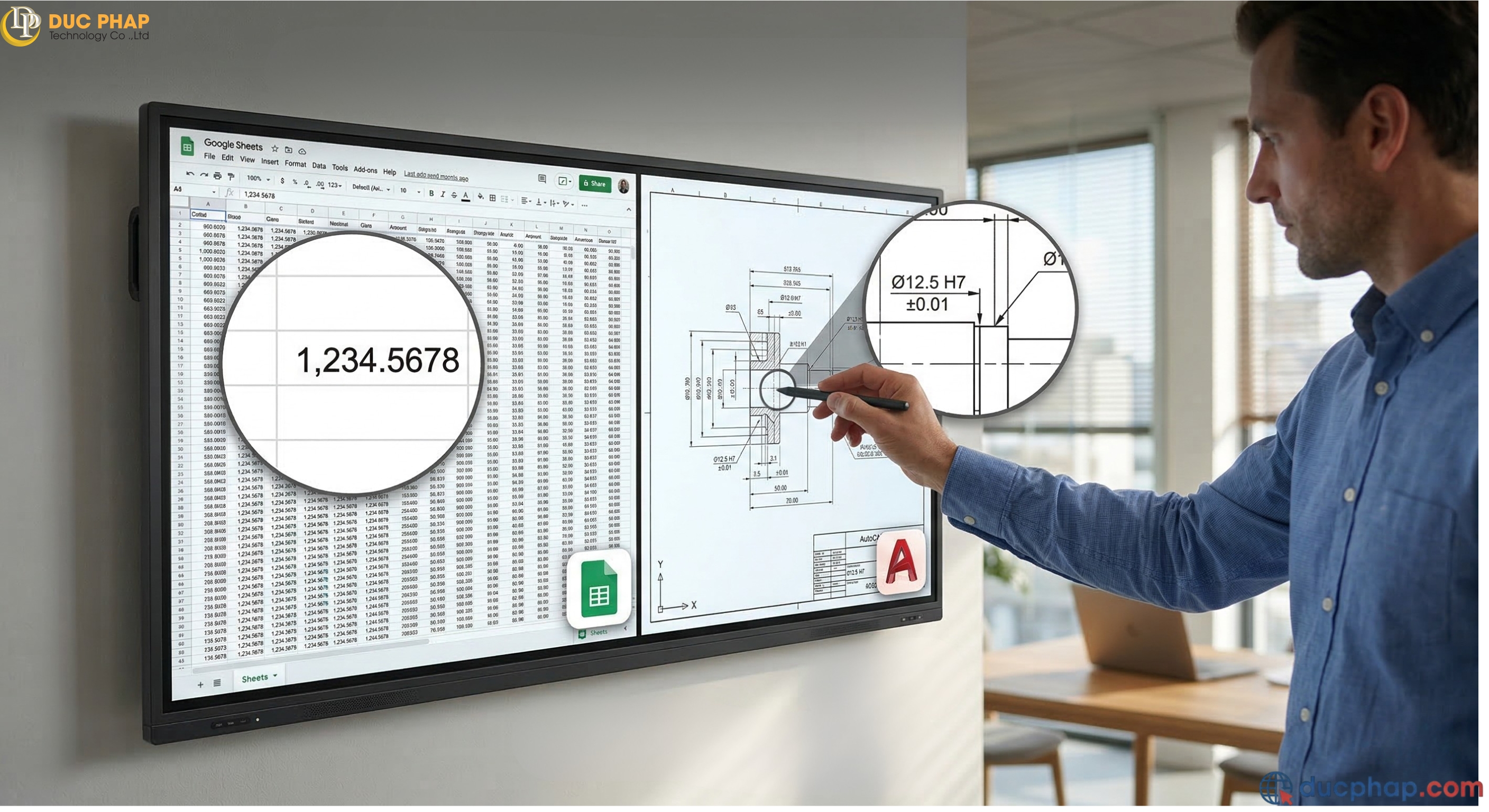 - Độ phân giải siêu nét 4K UHD: Được trang bị dải điểm ảnh 3840 x 2160 pixels kết hợp độ sáng từ 400 đến 450 nits, mọi chi tiết trên IFP đều hiện lên vô cùng sống động. Chẳng hạn, khi mở một bảng tính Google Sheets với dữ liệu dày đặc, hay khi các kỹ sư trình chiếu bản vẽ AutoCAD chi tiết, tất cả chữ số và đường nét đều giữ được sự sắc sảo, hoàn toàn không bị vỡ hạt ngay cả khi người xem tiến lại gần.