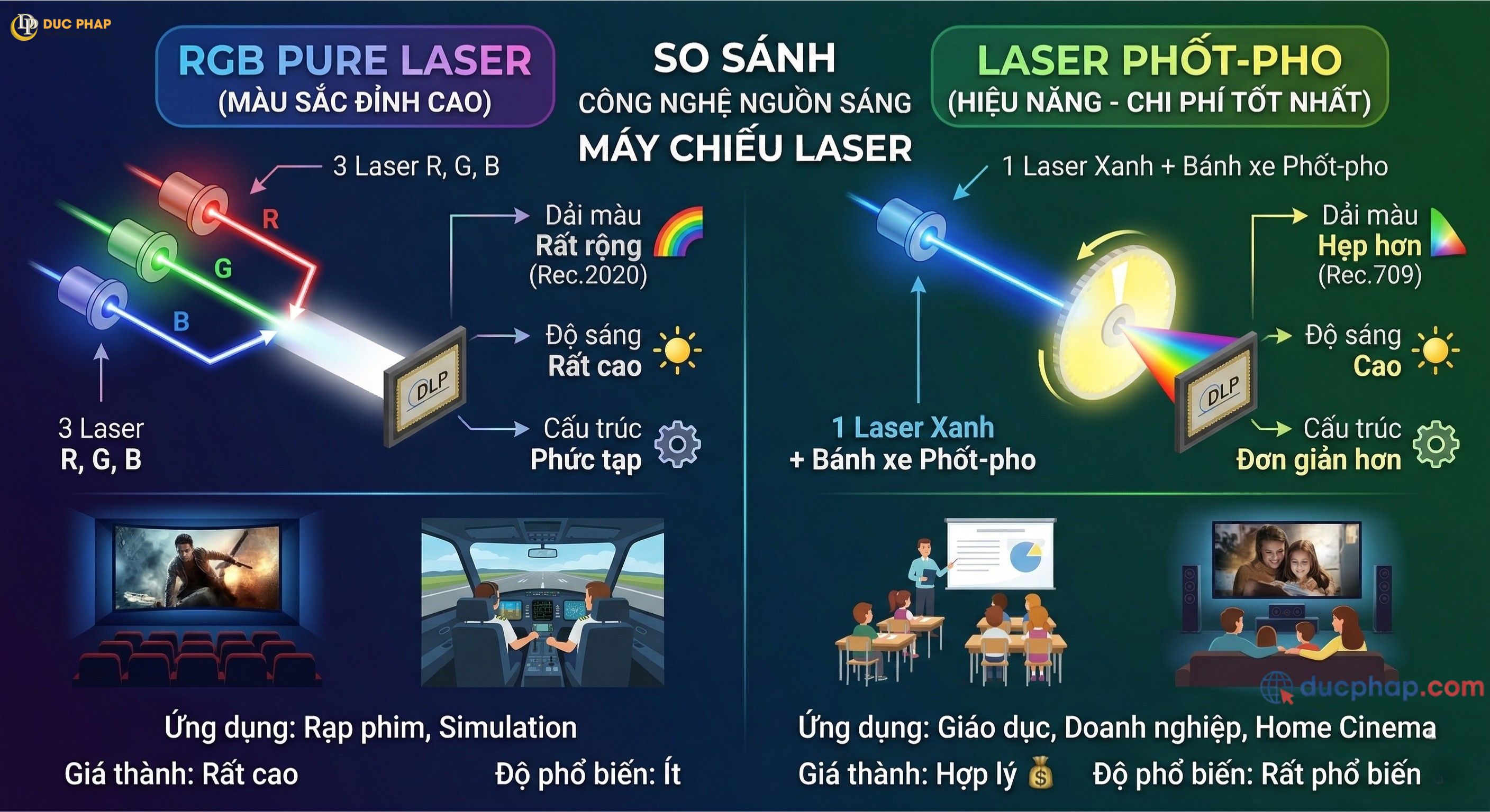 Thị trường trình chiếu hiện đại đang chia thành hai phân khúc chính: RGB Laser (Laser thuần 3 màu) và Laser Phosphor (Laser Phốt-pho). Mặc dù RGB Pure Laser sở hữu những thông số lý thuyết cực kỳ ấn tượng, nhưng trên thực tế, Laser Phốt-pho mới là sự lựa chọn tối ưu và cân bằng nhất, đáp ứng hoàn hảo từ môi trường giáo dục, văn phòng doanh nghiệp cho đến hệ thống giải trí gia đình.