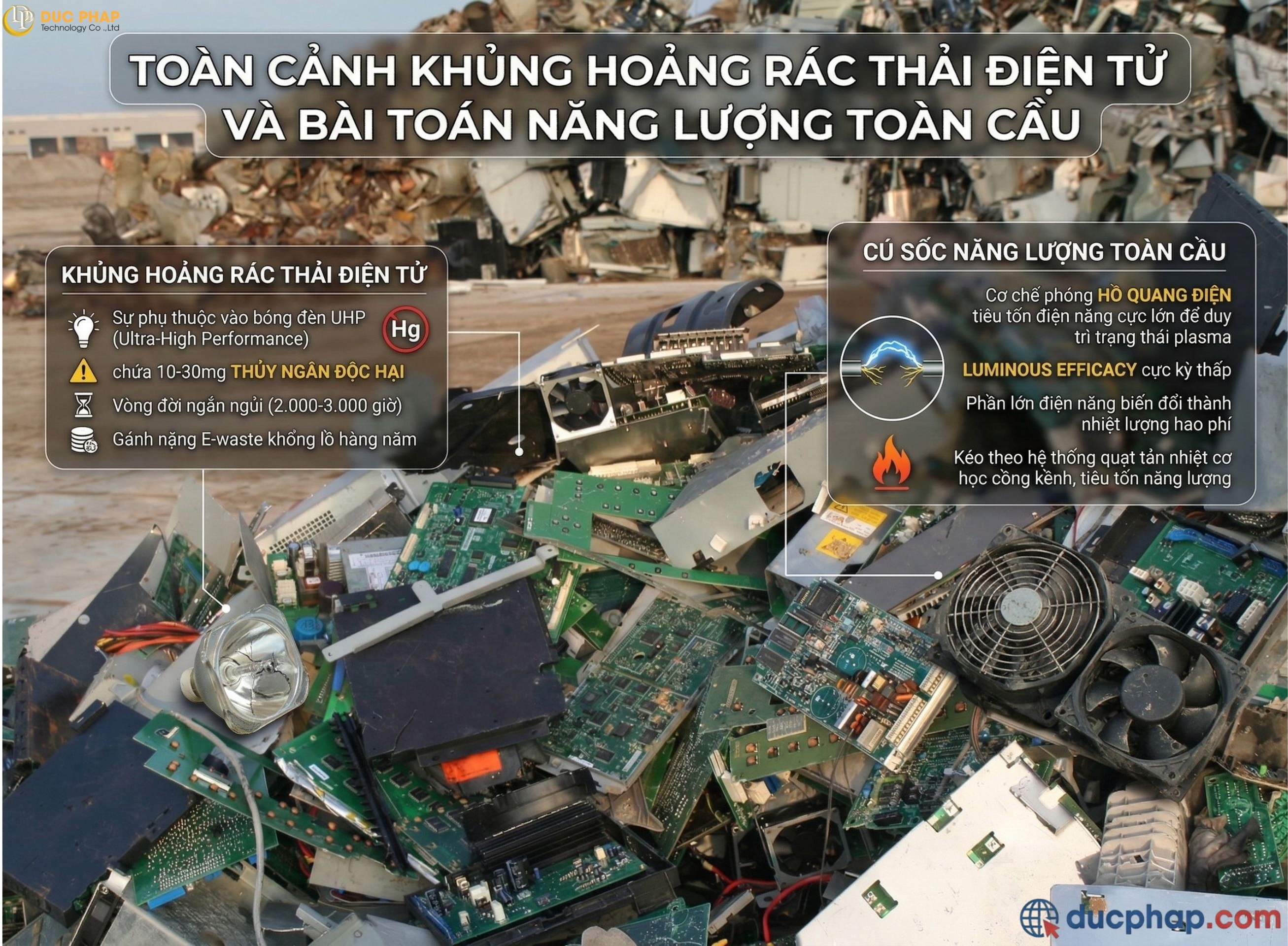 Đáng báo động nhất là sự hiện diện của thủy ngân. Mỗi bóng UHP chứa từ 10 đến 30mg thủy ngân, một kim loại nặng vô cùng độc hại. Khi kết thúc vòng đời và bị vứt bỏ, rủi ro phát tán độc chất ra môi trường tự nhiên là không thể xem thường.