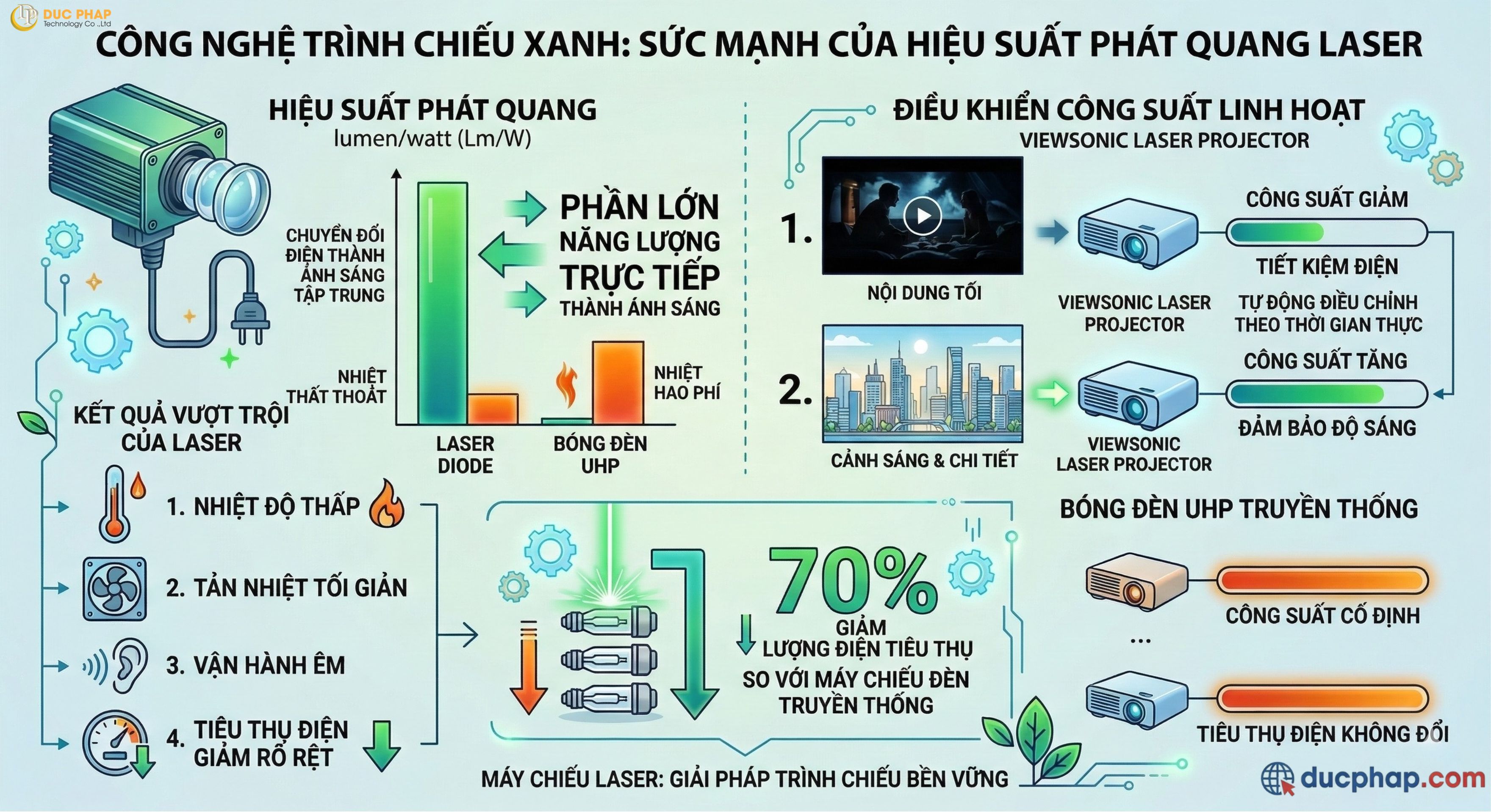 Cuộc chuyển giao từ máy chiếu dùng bóng đèn sợi đốt sang kỷ nguyên laser không đơn thuần là một bản cập nhật về độ phân giải hay màu sắc, mà nó phản ánh tầm nhìn mới của toàn ngành công nghiệp hiển thị. Khi thế giới ngày càng khắt khe hơn với các tiêu chí về bảo toàn năng lượng, vòng đời sản phẩm và trách nhiệm sinh thái, các thiết bị trình chiếu cũng buộc phải "tiến hóa" để đáp ứng bộ quy chuẩn vận hành xanh này.