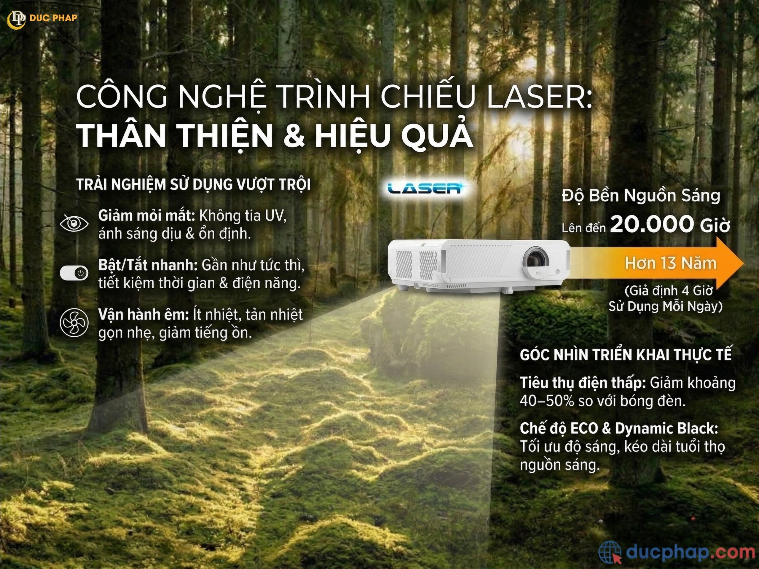 Sở hữu ưu điểm không sử dụng bóng đèn (lamp-free), tự hào với độ bền nguồn sáng vươn tới ngưỡng 20.000–30.000 giờ đi kèm khả năng tiết kiệm điện vượt trội, công nghệ laser chính là mảnh ghép hoàn hảo cho bài toán đầu tư dài hạn. Sự lột xác này không những giải phóng người dùng khỏi rắc rối thay thế linh kiện mà còn chung tay đẩy lùi gánh nặng rác thải điện tử tích tụ qua từng năm.