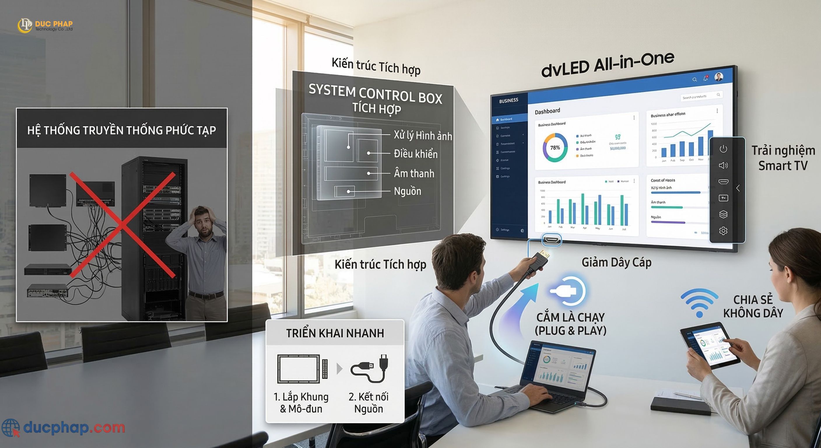 Sự ra đời của công nghệ dvLED All-in-One đã thực sự biến một cỗ máy công nghiệp rườm rà thành một thiết bị hiển thị thông minh, tiện dụng và mang tính thẩm mỹ cao. Vượt ra khỏi việc giải tỏa những không gian ngập tràn dây cáp lộn xộn, giải pháp này còn mở ra một kỷ nguyên hoàn toàn mới – nơi những tấm màn hình khổng lồ có thể tự do đồng hành cùng doanh nghiệp ở bất kỳ không gian nào.