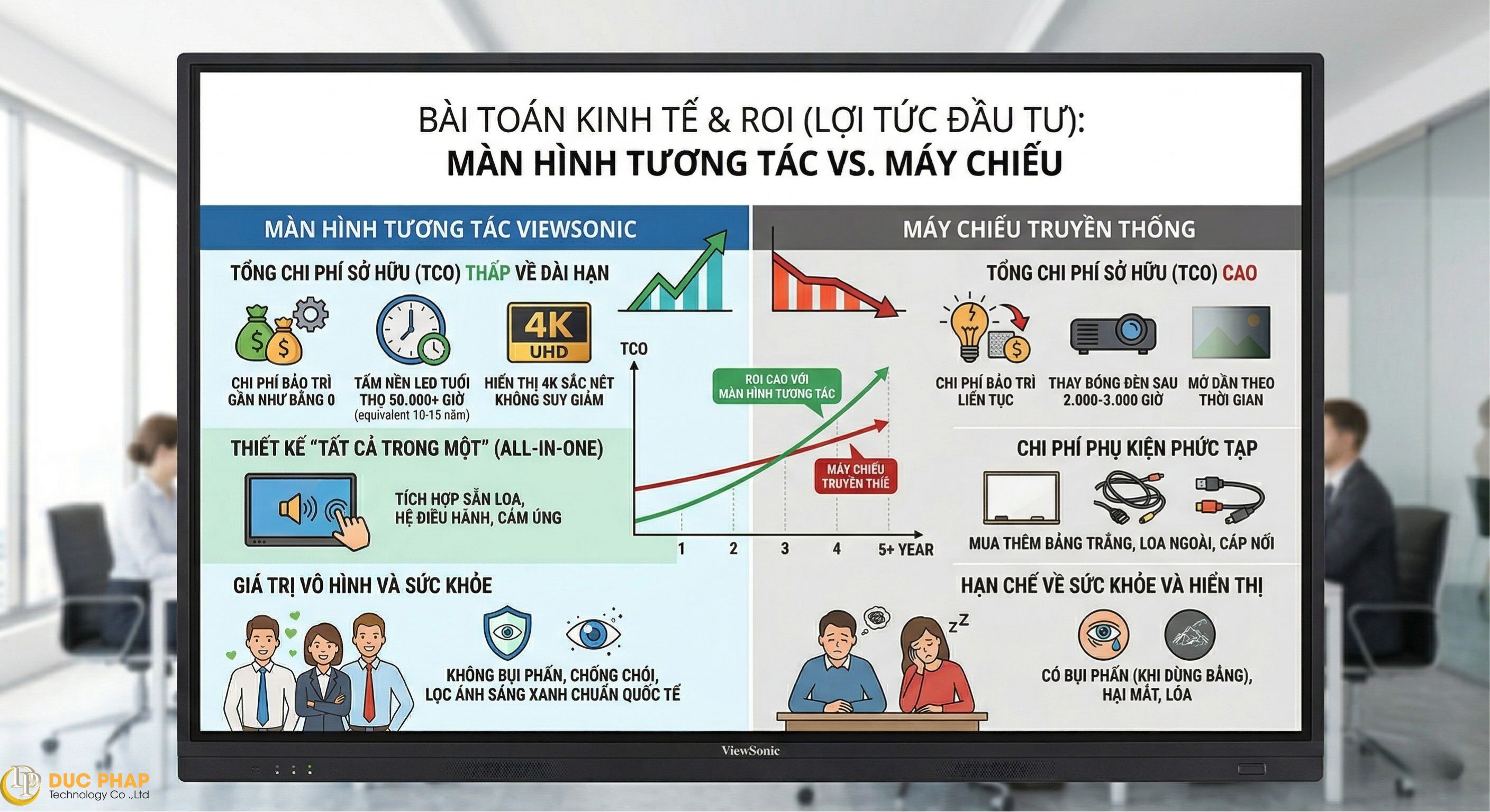 Rào cản tâm lý lớn nhất khi khách hàng tiếp cận màn hình tương tác thường là mức giá khởi điểm nhỉnh hơn đôi chút so với máy chiếu. Nhưng nếu đặt lên bàn cân đầu tư dài hạn (Tổng chi phí sở hữu - TCO), màn hình tương tác lại mang đến một bài toán siêu tiết kiệm đáng kinh ngạc: