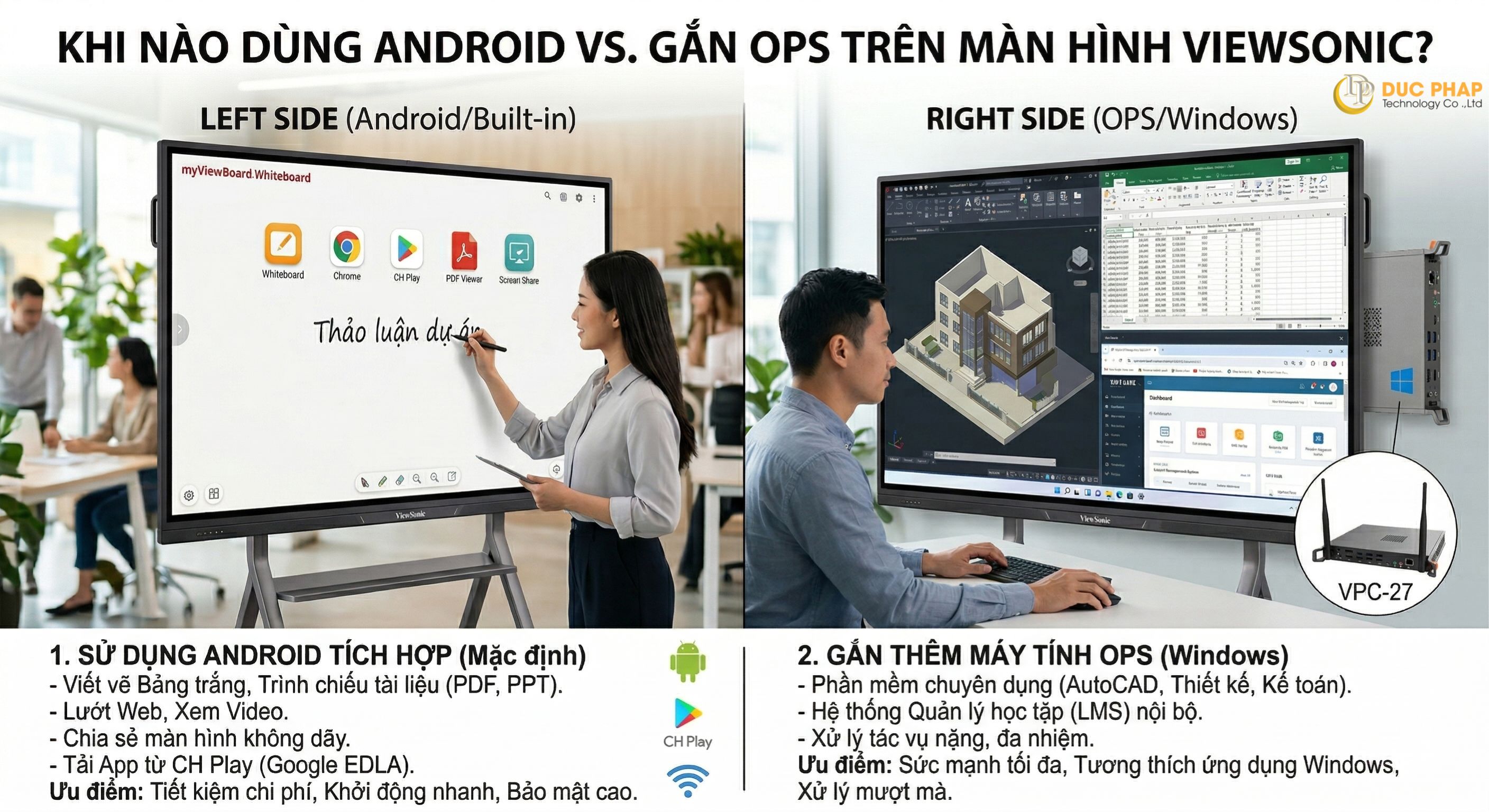 - Hệ điều hành Android tích hợp (Tiết kiệm & Thực dụng): Nếu công việc của bạn chỉ xoay quanh việc viết vẽ lên bảng trắng, trình chiếu tài liệu (PDF, PowerPoint), lướt web, mở video và chia sẻ màn hình không dây từ điện thoại/laptop thì Android là quá đủ. Hơn thế nữa, các dòng màn hình thế hệ mới (hỗ trợ chuẩn Google EDLA) cho phép bạn tải ứng dụng trực tiếp từ CH Play, khởi động chớp nhoáng như một chiếc máy tính bảng và sở hữu lớp bảo mật vững chắc, hoàn toàn miễn nhiễm với virus.
