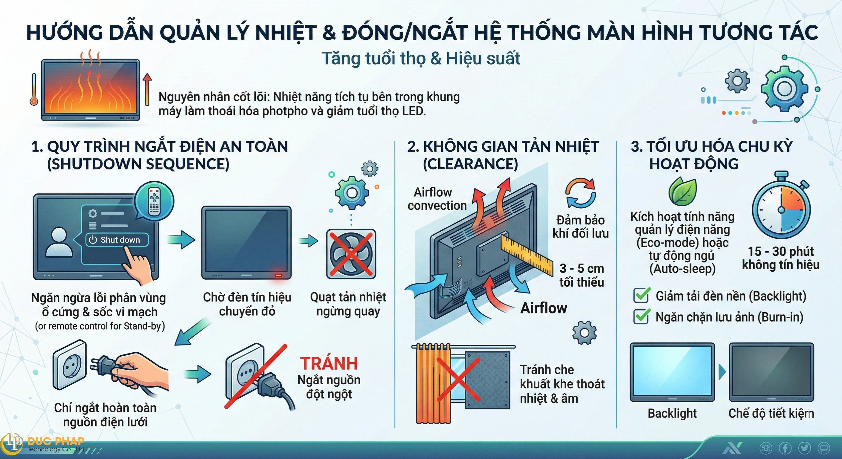- Quy trình ngắt điện an toàn (Shutdown Sequence): Hãy nhớ rằng, màn hình tương tác thực chất là một hệ thống máy tính đa nhiệm cực kỳ phức tạp. Hành động rút phích cắm hay cúp cầu dao đột ngột khi hệ điều hành đang hì hục xử lý dữ liệu sẽ dẫn đến thảm họa lỗi phân vùng ổ cứng và sốc vi mạch toàn diện. Luôn tuân thủ nguyên tắc: Thực hiện lệnh "Shut down" đàng hoàng qua hệ điều hành hoặc dùng remote đưa máy về chế độ Stand-by. Chỉ ngắt hẳn nguồn điện lưới khi đèn tín hiệu đã chuyển sang màu đỏ và hệ thống quạt tản nhiệt đã hoàn toàn chìm vào tĩnh lặng.