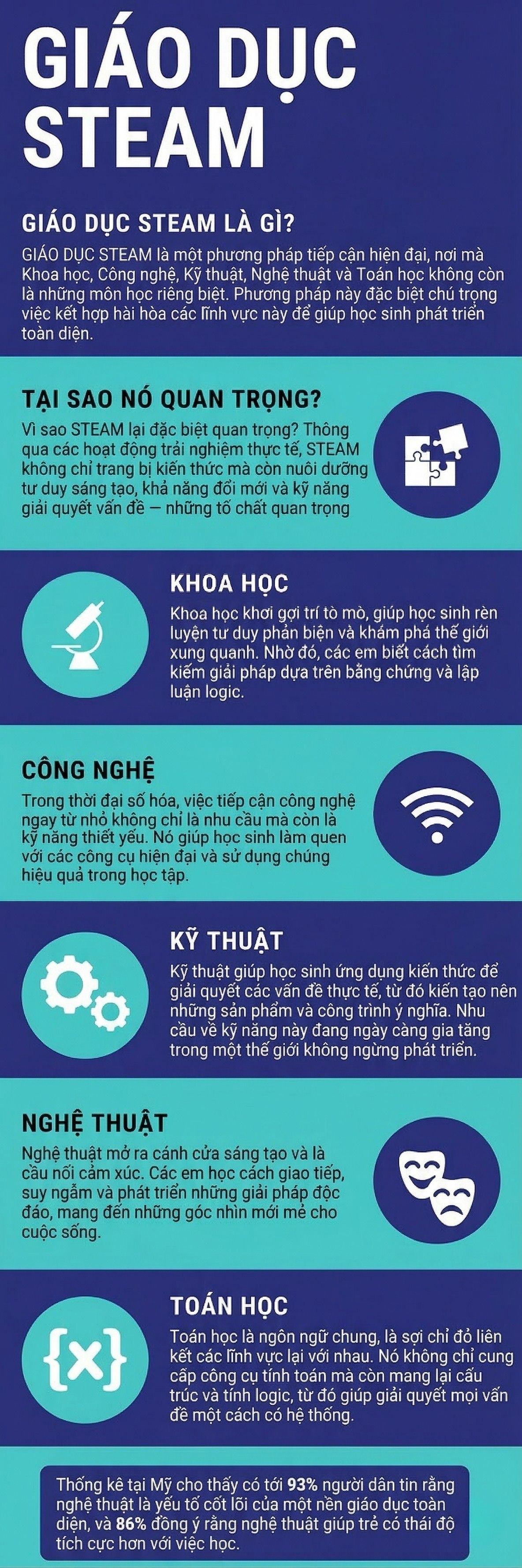 Giáo dục STEAM đề cao nghệ thuật như một thành phần không thể thiếu. Nghệ thuật giúp người học phát triển sự sáng tạo, tư duy linh hoạt, kỹ năng giao tiếp và khả năng trình bày – những yếu tố quan trọng cho tương lai.